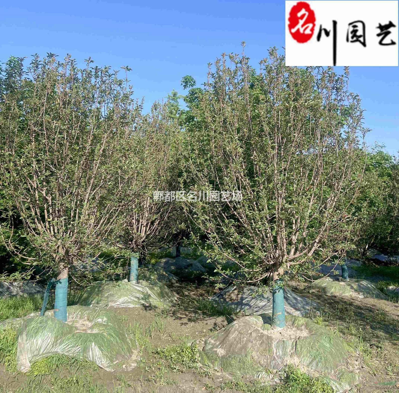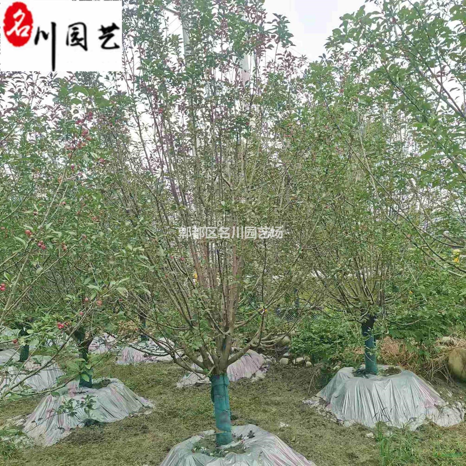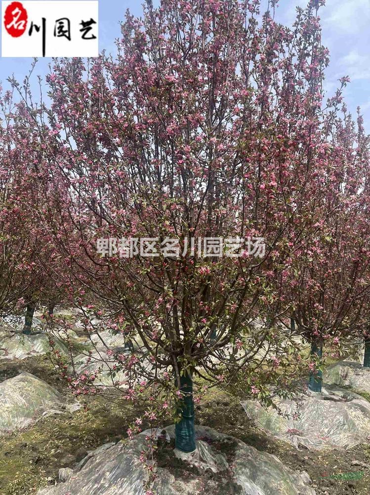 绚丽海棠:蔷薇科苹果属。属北美海棠的栽培品种。落叶小乔木,树势强,树姿直立,树形圆而紧凑,树干棕红色,皮孔大而多。枝条斜出,小枝紫红色,老枝红褐色。嫩叶紫红色,逐渐变为翠绿色;叶卵圆形至椭圆形,先端短尖,基部圆形或宽楔形,边缘具钝锯齿。总状伞形花序,花期4月中下旬,花蕾深紫红,花深粉红色,杯状,花开繁密而艳丽,花梗紫红色,密被柔毛,半直立,果期6-10月。